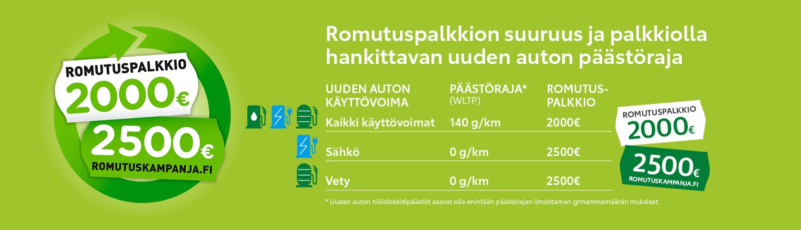 Valtio myöntää 2 000 euroa romutuspalkkiota sellaisen uuden henkilöauton hankintaan, jonka hiilidioksidipäästöt ovat enintään 140 g/km. Uusille nollapäästöisille sähkö- ja vetyautoille valtion romutuspalkkio on 2 500 euroa.