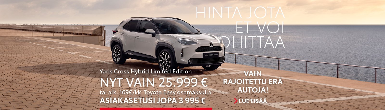 Tarjoamme rajoitetun erän edullisia Yaris Cross Limited Edition -malleja ja huippuvarusteltuja Yaris Cross Limited Platinum Edition -malleja nyt nopeaan toimitukseen kampanjahintaan. Hyödynnä myös Toyota Easy Osamaksu -rahoitusetu 2,99 % korko + kulut.